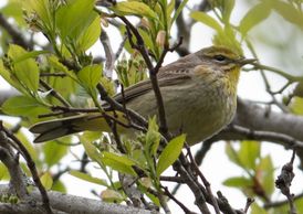 This female warbler lacks the distinctive broad black mask of her mate. The distinctive “witchity-witchity-witchity” song alerts us to the presence of this species as they make their way north.