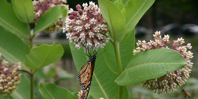 Monarch caterpillars feed on the leaves of this tall plant. The pink flowers develop into large seed pods, and the seeds are then disperses by the wind.