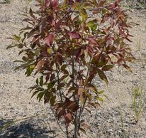 This slender, upright shrub forms thickets by aggressively spreading its dense, fibrous roots. Considered invasive, it has become extensive in the panne area south of the beach house. It is also showing up on the north end, near the NU boathouse.